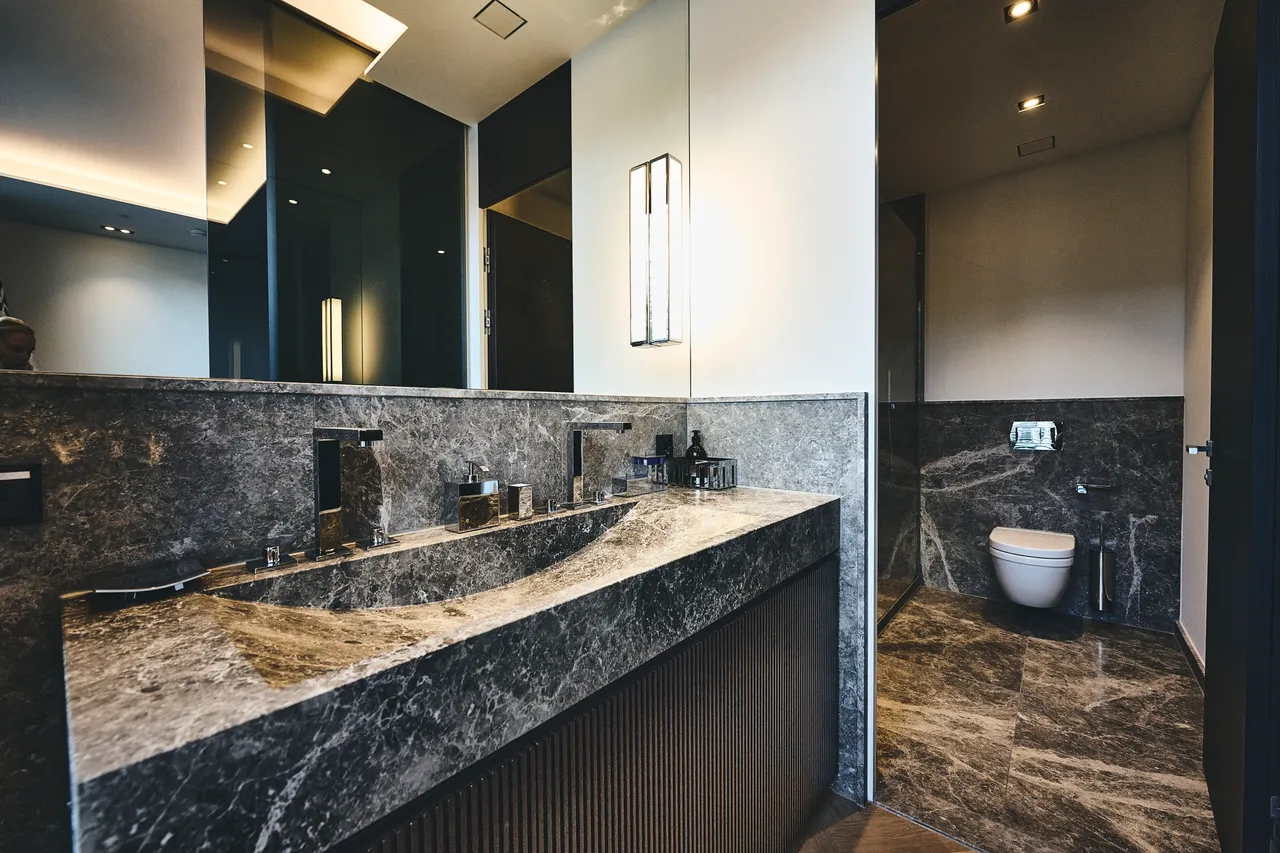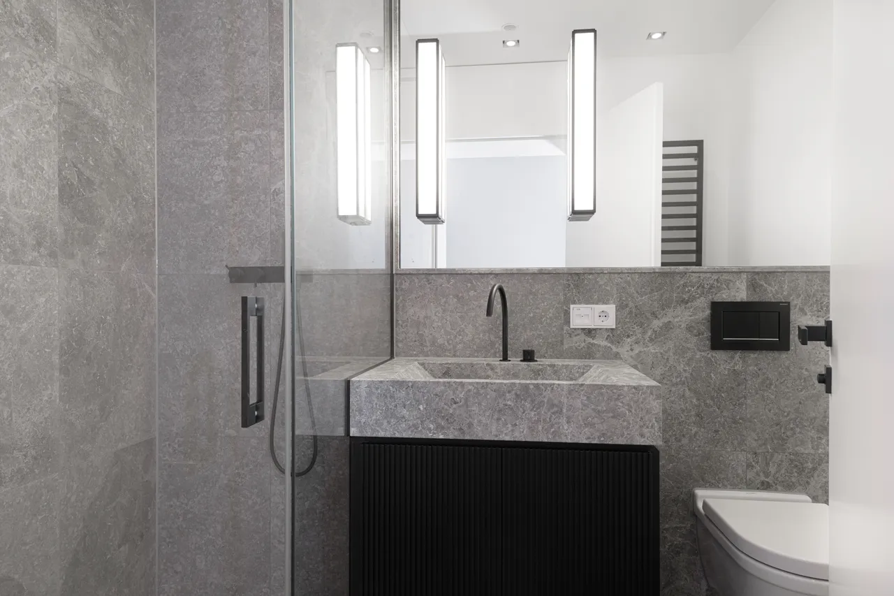 Schon beim Betreten erkennen Sie sofort die Wertigkeit dieser Immobilie. Bequem und diskret fahren Sie mit ihrem eigenen Aufzug in Ihr neues Stadt Domizil. Durch die komplett bodentiefe Fensterfront kann man das Geschehen der Stadt von nahezu jedem Zimmer beobachten. Das Master-Schlafzimmer befindet sich im hinteren Teil des Grundrisses mit Bad en suite. Wer einen großen Kleiderschrank sucht ist auch hier genau Richtig aufgehoben, Platz genug bietet diese attraktive Wohnung. Ein drittes Zimmer das großzügig geschnitten ist und als Kinder/Gästezimmer oder Homeoffice genutzt werden kann ist ebenso selbstverständlich wie ein weiteres Duschbad und eine seperate Gäste Toilette mit Waschmaschinen Anschluß. Die Badezimmer mit hochwertigem Feinsteinzeug sind ohne Zweifel Eye-Catcher und runden das Bild dieser Luxus Immobilie ab.