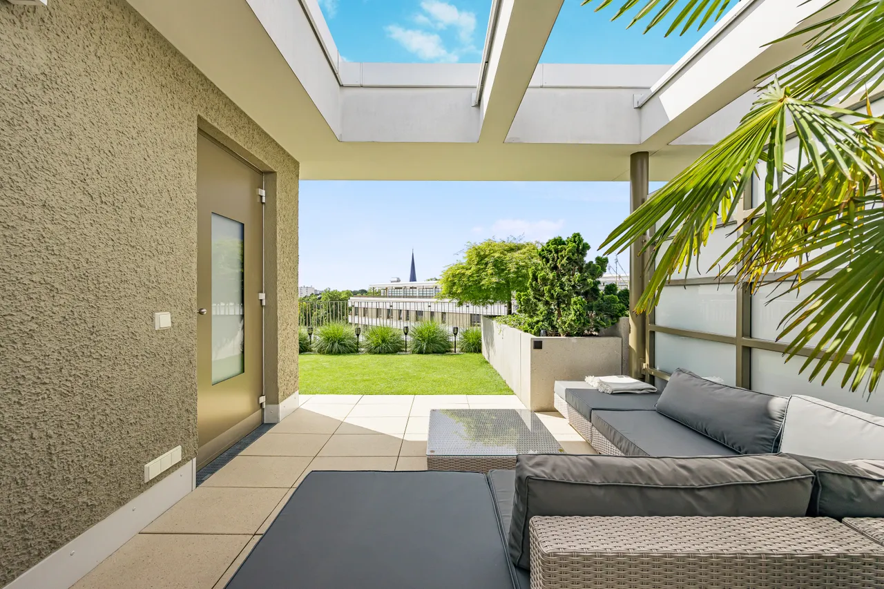 Das Highlight: Ein ca. 25 m² großer Dachgarten, der mit Bewässerungssystem und Rasenroboter leicht zu pflegen ist. Hier erleben Sie Natur pur mitten in der Stadt – ein luxuriöses Stück Grün, das zum Entspannen, Feiern und Genießen einlädt.