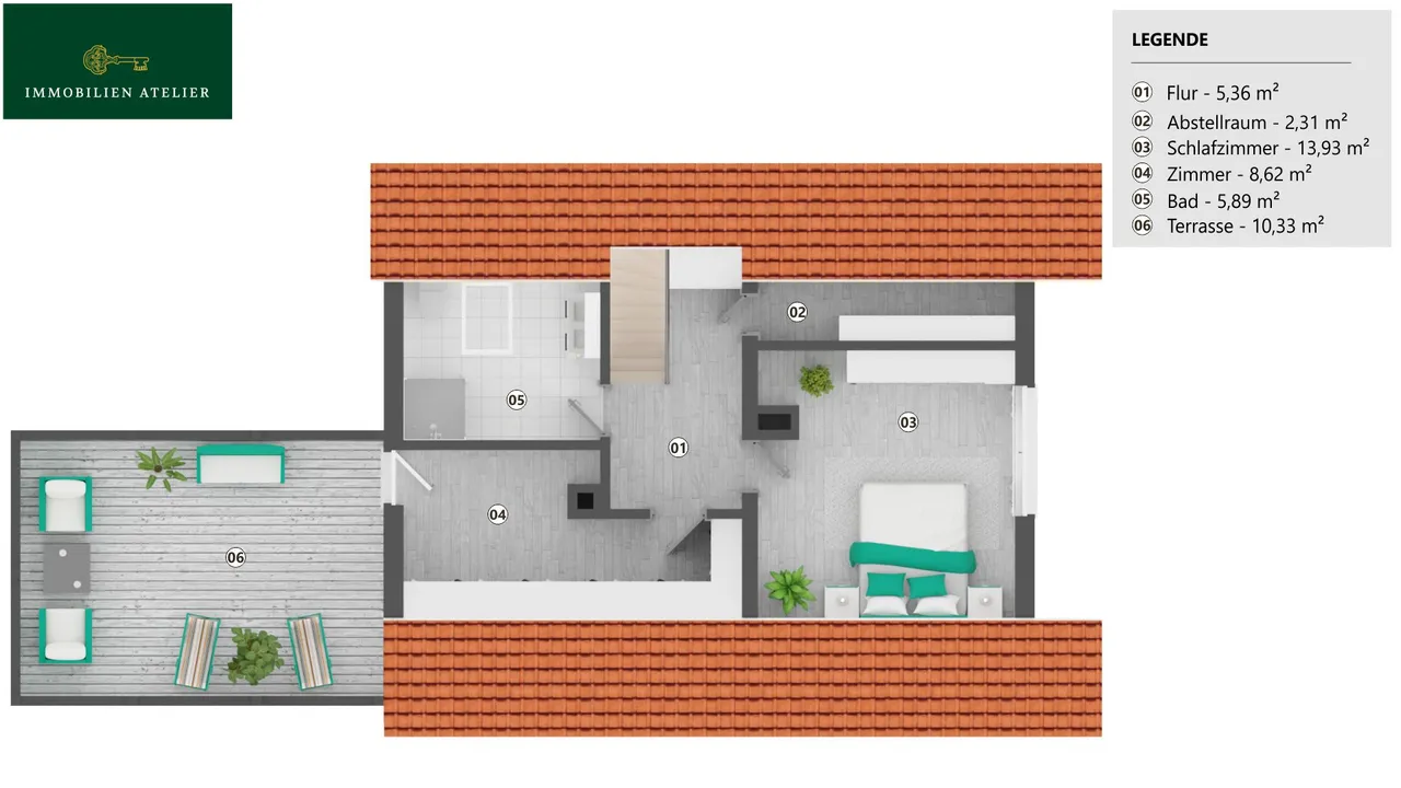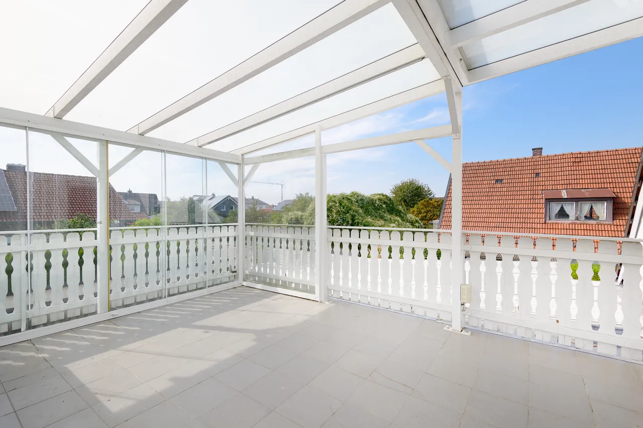Das Highlight dieser Etage ist zweifellos die ca. 22 m² große Dachterrasse mit elektrisch gesteuerten Markisen – ein privates Sonnenrefugium, das zum Frühstücken, Entspannen oder Träumen einlädt.