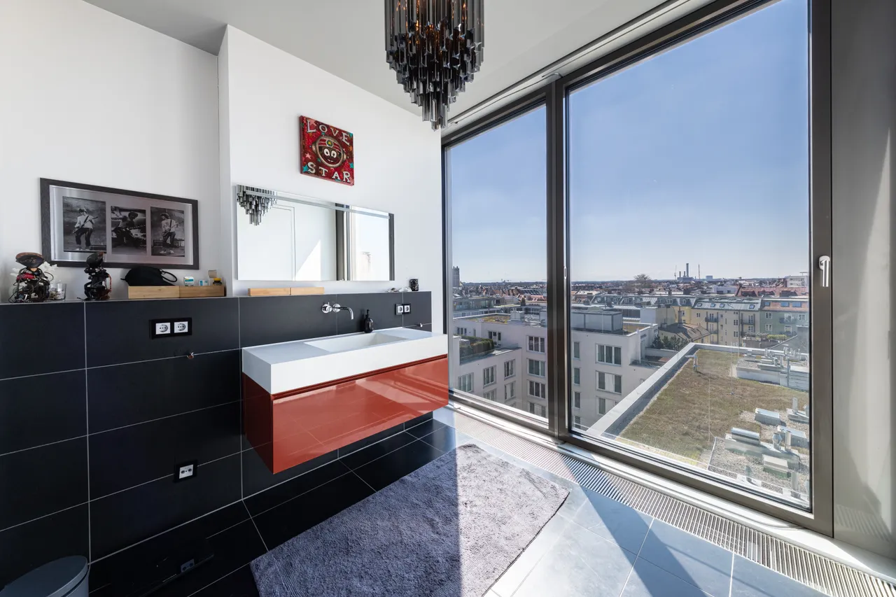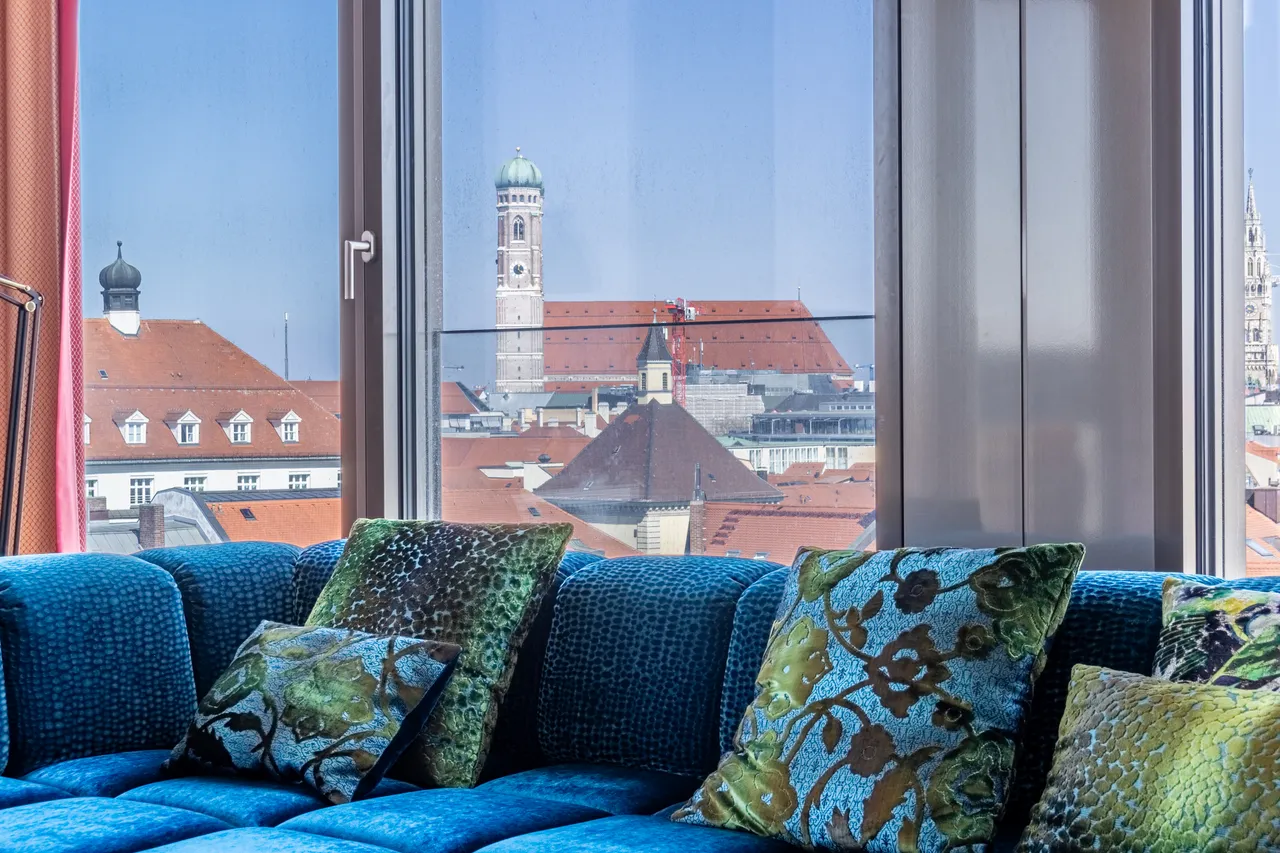 Es ist kein Poster auf die Münchner Altstadt das Sie im Hintergrund des stilvollen Mobiliars in dieser einzigartigen Wohnung vermuten. Dieser Ausblick ist Realität und ist in München einzig und allein in einer der oberen Etagen des Seven Towers zu bewundern. Dies kann ihr täglicher Ausblick von der Couch, von der Küche, dem Schlafzimmer oder dem Badezimmer werden. 180 Grad Blick auf die Wahrzeichen der Stadt. Willkommen in Ihrem neuen zu Hause hoch über München.