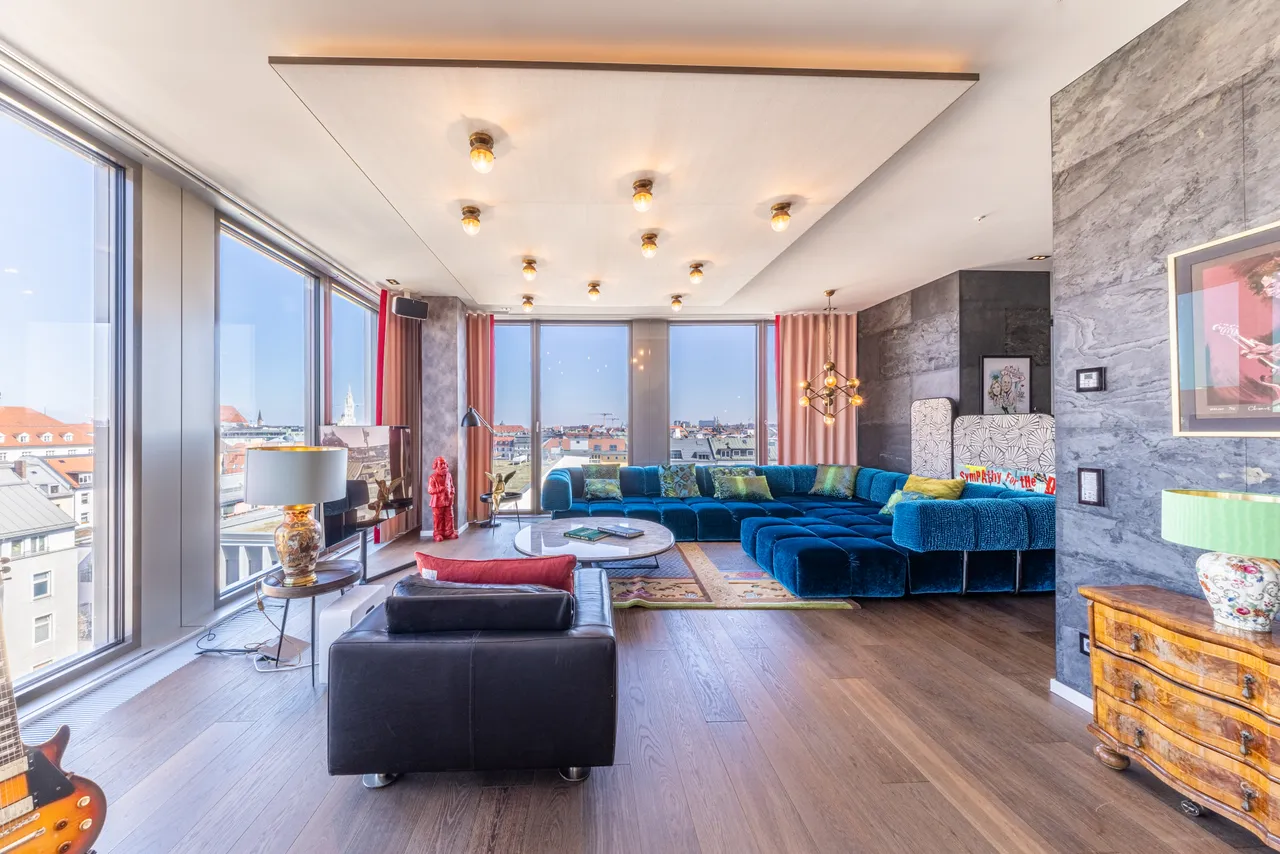 Diese Loft Wohnung mit drei Zimmern besticht durch Helligkeit, Großzügigkeit und einzigartigen Ausblicken in drei Himmelrichtungen über Münchens Altstadt. (Westen, Osten und Norden). Schon beim betreten der Wohnung werden Sie über den Blick den Sie von hier aus genießen sprachlos sein. Die Wohnung bietet eine offene Luxus Designer Küche mit Kochinsel und Sitzmöglichkeiten. Das weitläufige Wohnzimmer, mit mehren Rückzugsmöglichkeiten wie der Essbereich oder die große Sofalandschaft sind einladend und gemütlich zugleich. Die Wohnung bietet neben dem großen Wohnbereich auch zwei Schlafzimmer die hohe Privatsphäre garantieren das diese jeweils seitlich des Wohnbereichs unter gebracht sind und zwei eigene und vollständigen Bäder en Suite bietet. Die bodentiefen Fenster die sich durch die gesamte Wohnung ziehen, sorgen aus jedem Zimmer für atemberaubende Ausblicke zu jedem Zeitpunkt. Die großen Fenster lassen sich mit Jalousien verschatten, automatische Vorhänge zum zu oder aufziehen sind in dieser Wohnung ebenso selbstverständlich wie eine Klima- und Alarmanlage.