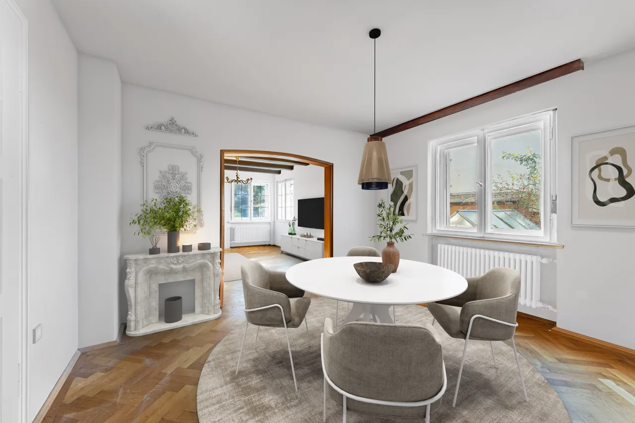 Bereits beim Betreten öffnet sich ein großzügiges, einladendes Entree, das mit seinem klassischen Charme und einer beeindruckenden Raumhöhe den Stil vergangener Zeiten atmet. Von hier führt der Weg in das lichtdurchflutete Wohn- und Esszimmer, das durch einen eleganten Torbogen optisch verbunden, aber dennoch dezent gegliedert ist. Die großen Fensterflächen lassen viel Tageslicht herein und schaffen eine luftige, offene Atmosphäre.