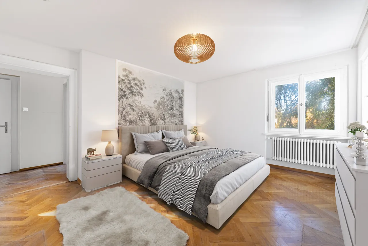 Im Obergeschoss das Sie über eine wunderschöne Holztreppe erreichen befinden sich drei charmante Schlafzimmer, die den klassischen Grundriss der 1920er-Jahre elegant widerspiegeln. Das Badezimmer sowie die grossse zur Gartenseite gelegene Dachterrasse mit traumhaftem Blick ins Grüne verleihen dieser Etage eine ganz besondere Wohnqualität.