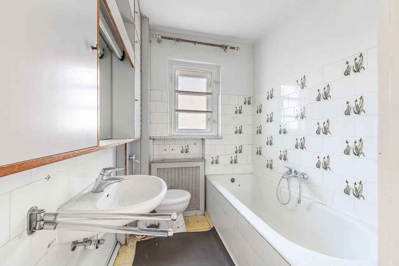 Ein besonderer Blickfang ist die helle Leseecke mit einem großen Fenster zur Gartenseite – perfekt als kleine Bibliothek oder Rückzugsort zum Entspannen. Die angrenzende Küche bietet die Möglichkeit, diese zum Wohnbereich hin zu öffnen und so ein modernes Wohnkonzept mit historischem Flair zu verwirklichen. Ein stilvolles Gäste-WC rundet das Erdgeschoss ab.