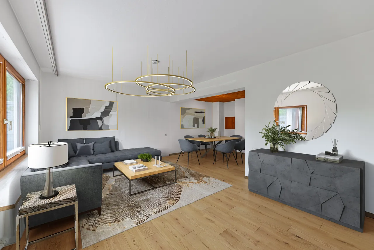 Betreten Sie den hellen, großzügigen Eingangsbereich, der direkt ein Gefühl von Weite und Gemütlichkeit vermittelt. Die Küche die sich zum Wohnzimmer auch öffnen lässt bietet Platz für eine große und komfortable Küche. Ein Gäste-WC sorgt für Komfort, während das Wohn- und Esszimmer mit großen Fenstern den Blick in den sonnigen Garten freigibt. Die angrenzende Südterrasse lädt zu entspannten Stunden im Freien ein – ob Frühstück in der Sonne oder laue Sommerabende.