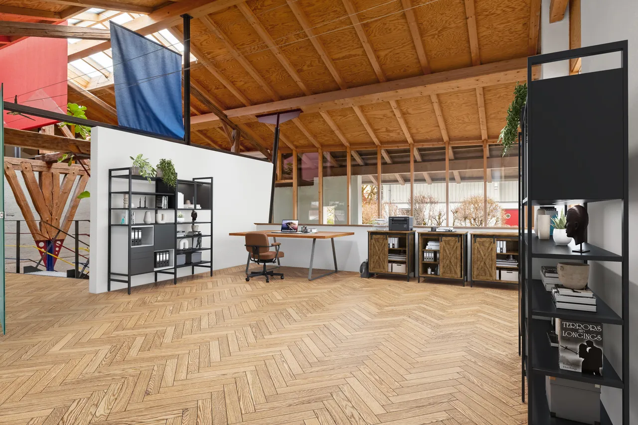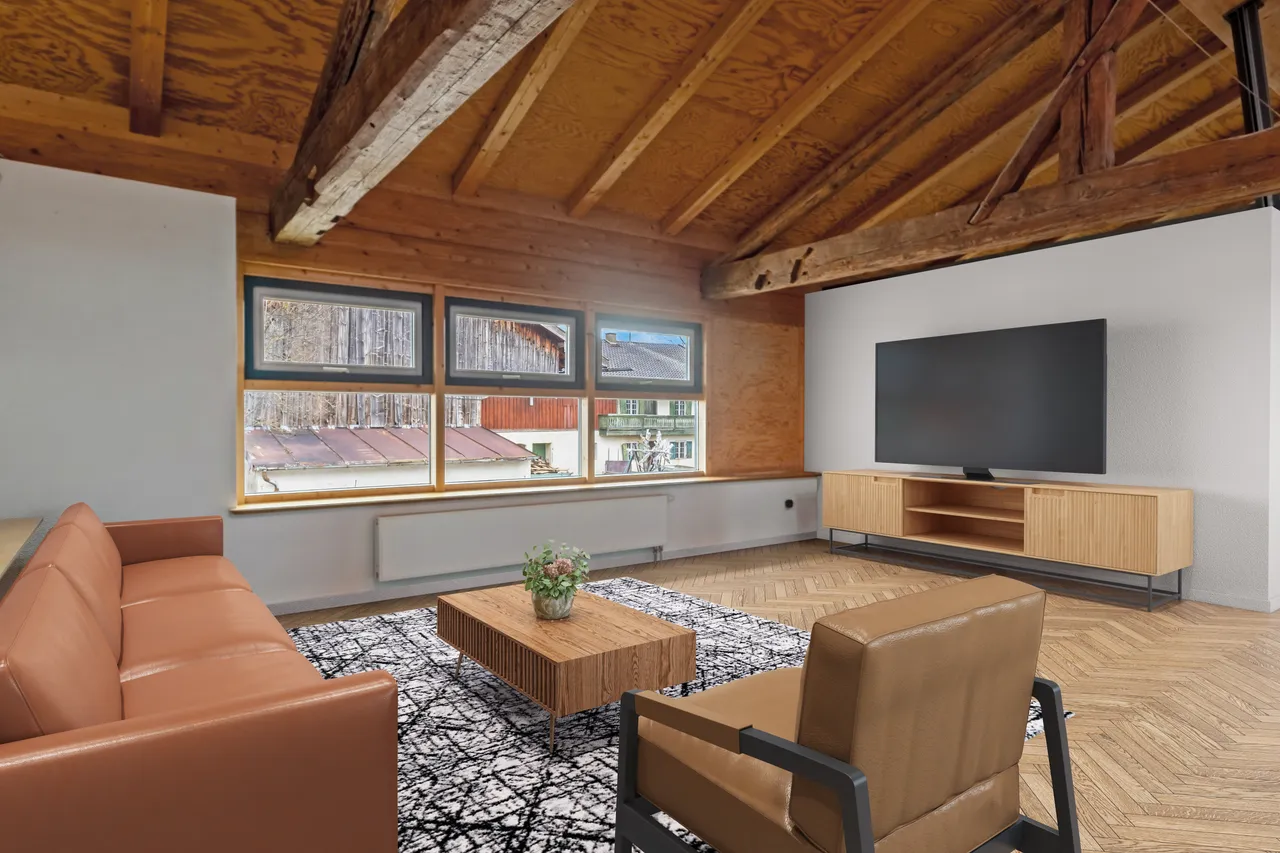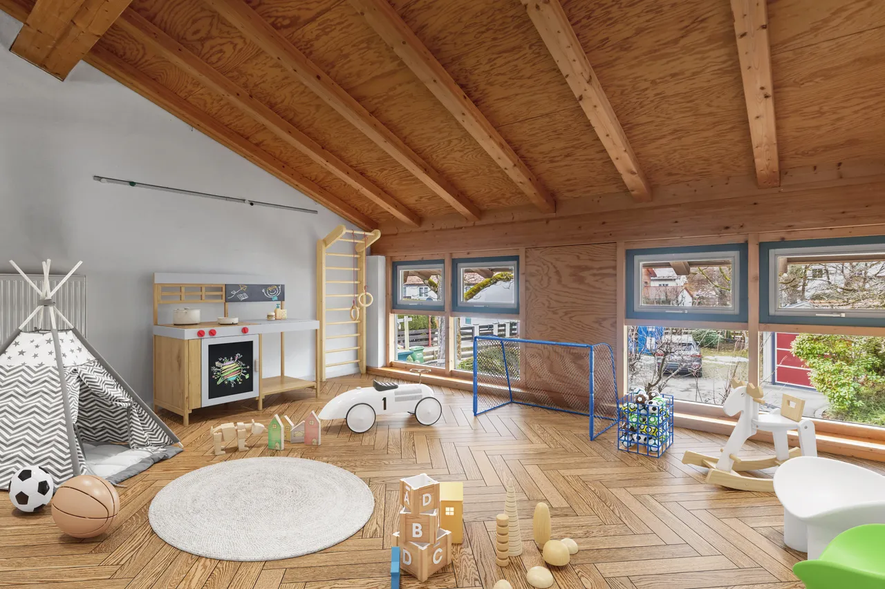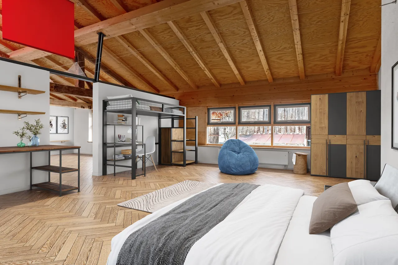 Über die markante Stahltreppe geht es hinauf ins Obergeschoss, wo unter den hohen Dachbalken Freiraum für Kinderzimmer, Homeoffice oder eine stilvolle Lounge wartet. Alles ist möglich – für Familien, Kreative oder Architekturliebhaber, die ihren Traum vom Wohnen leben möchten.