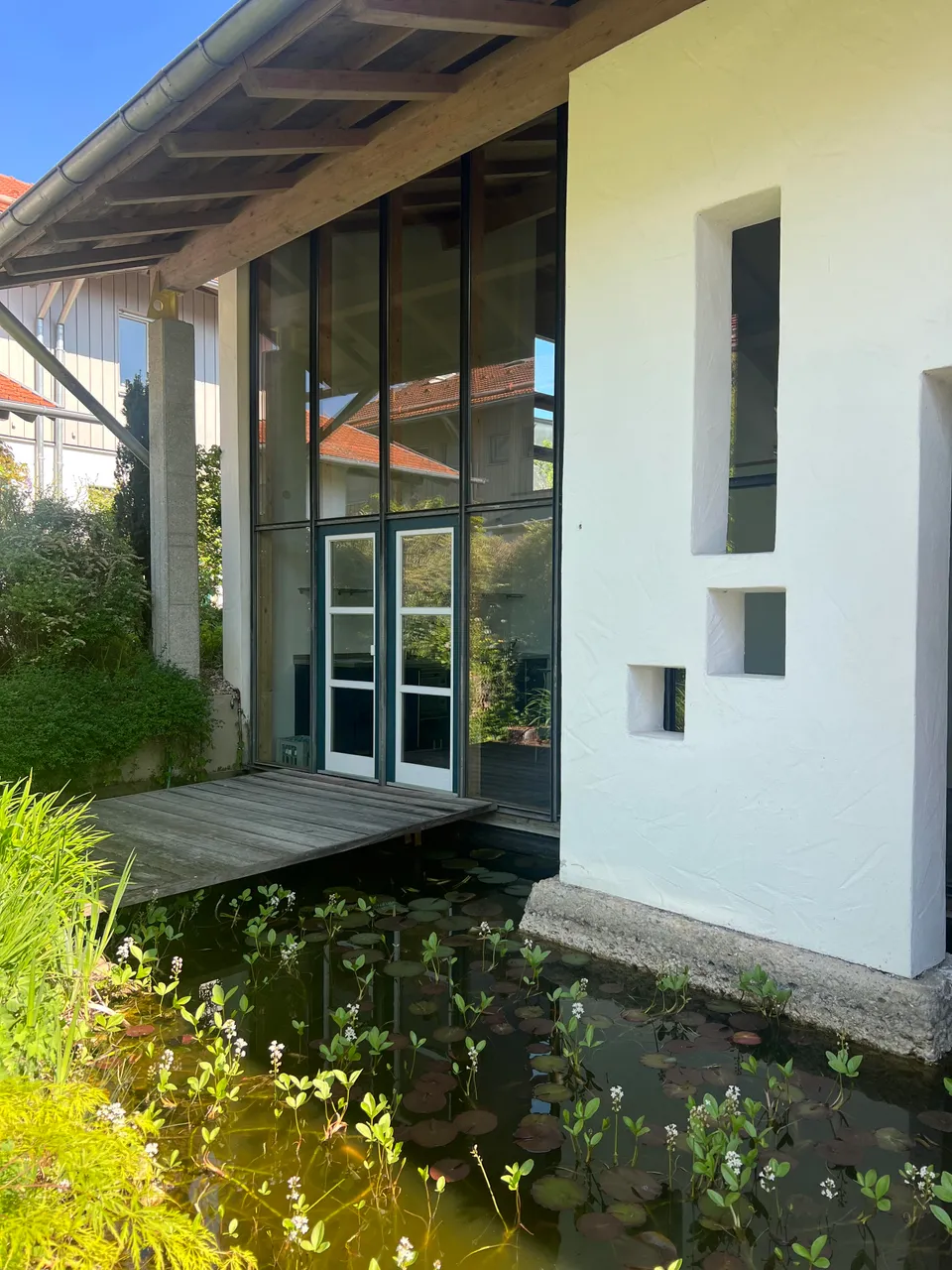 Schon der Weg hinein ist ein Erlebnis: Über eine kleine Brücke gelangen Sie vorbei an einem liebevoll angelegten Teich in das spektakuläre Foyer – ein Entrée, das Gäste staunen lässt und sofort das Gefühl von Weite und Eleganz vermittelt.